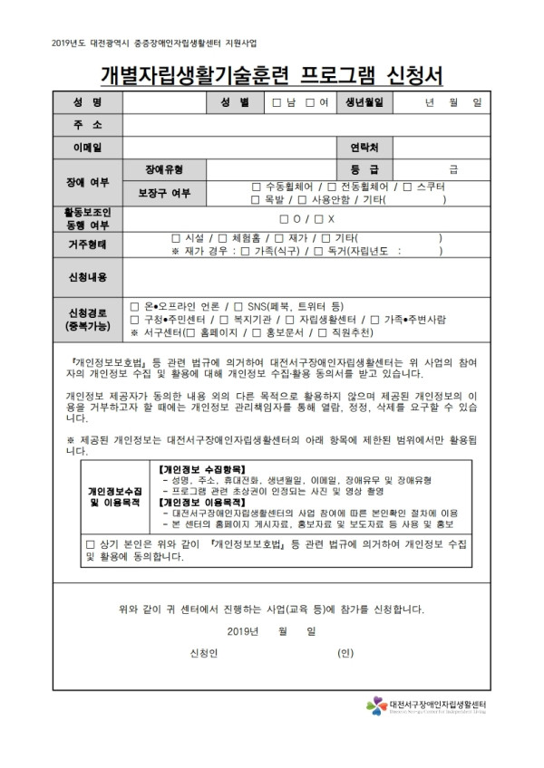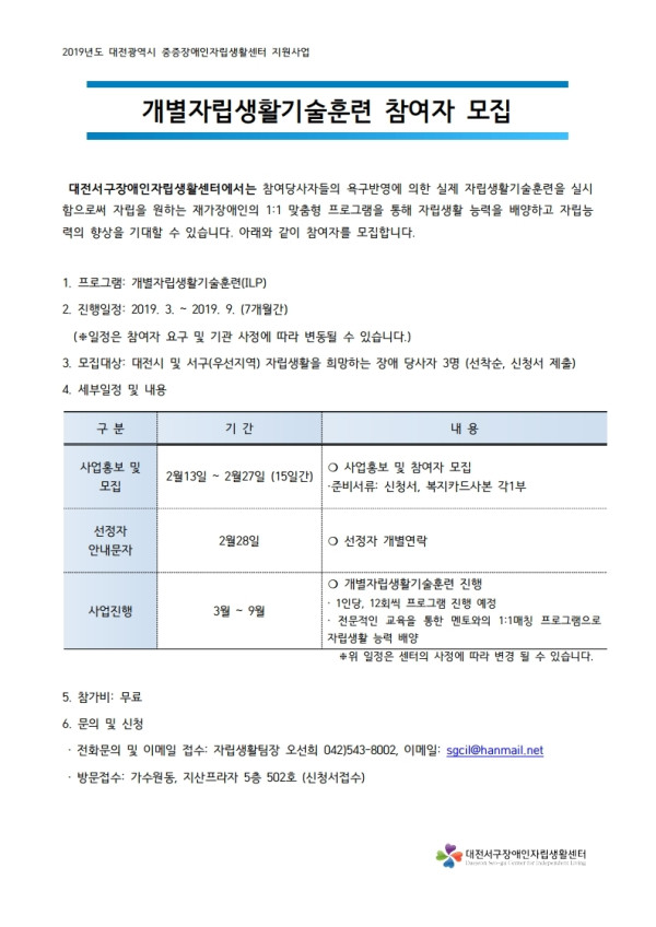 개별자립생활기술훈련 참여자 모집 안내문